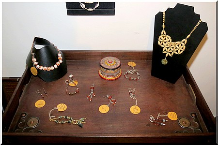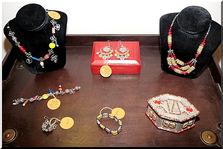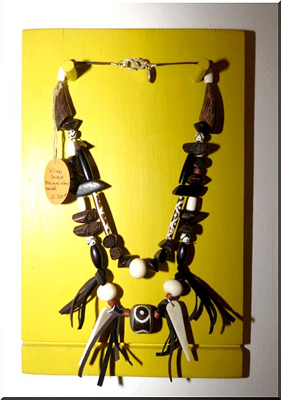 L’exposition offre à voir de la matière souvent utilisée par des peuples de l’Afrique de l’Ouest, de l’Afrique méridionale, de l’Afrique Centrale comme les Bamouns, Massaï, Douala, Luba, Sao, Sarakholé, Sénoufo, Agni ou encore Foulani. On découvre également des bracelets Apollo faits avec les perles de Kiffa ou de Zouérate.