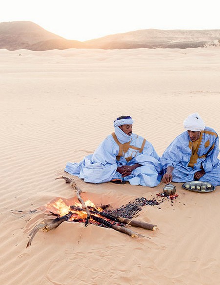 J’ai perdu toute notion du temps. Après le dîner, voici la cérémonie du thé, indissociable de la vie nomade, servi par Tegedi et Adrami, deux trentenaires. En Mauritanie, on boit trois thés, l’un après l’autre : le premier est amer comme la vie, le deuxième doux comme l’amour, le troisième suave comme la mort. Puis, dès 22 h, le spectacle est dans le ciel.