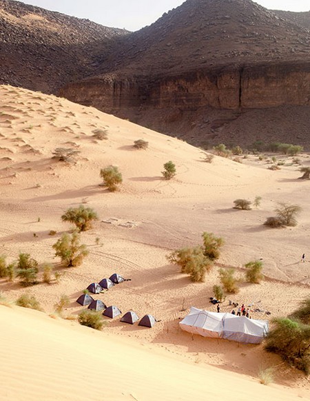 Nous sommes accueillis sous une immense tente, patchwork de tissus chamarrés. Tout le monde enlève ses chaussures et s’assoit par terre. On nous présente un homme, qui semble régler un ballet depuis le matelas sur lequel il est allongé. « Lionel, Maurice, on est au complet ? Alors on va s’installer. » Mohammed, le grand boss, introduit Kadi, guide et régisseur général depuis plus de vingt ans, qui a servi d’intermédiaire entre les voyagistes et le gouvernement mauritanien.
