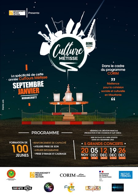 Lors du lancement de ce projet, les dates de la 8e édition du festival Culture Métisse ont dévoilés, avec au programme 5 grands concerts qui auront lieu le 20 novembre à l’Institut français de Mauritanie, le 5 Décembre à Riyad, le 12 Décembre à Arafat, le 19 Décembre à El Mina et le 26 Décembre à Toujounine.