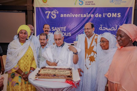 En présence de la Première Dame de Mauritanie, Dr Maryam Muhammad Fadel Al-Dah, du Ministre de la Santé, du Ministre de l'Environnement, du Ministre de l'Elevage, du Ministre d'Etat, de la Coordinatrice résidente du Système des Nations Unies et de la Représentante du bureau pays de l'OMS, une cérémonie a été organisée pour célébrer le 75ème anniversaire de l'Organisation mondiale de la santé (OMS) à Nouakchott.