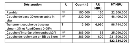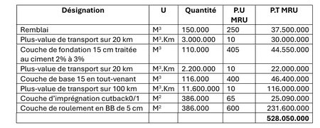 Soit 10.561.000 MRU (Dix millions cinq cent soixante et un milles ouguiya) au Km de voirie construite avec le tout-venant.