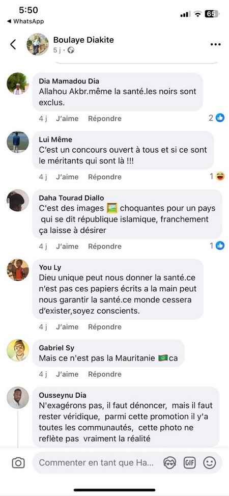 Parmi les commentaires, Dia Mamadou Dia explique : « Oh mon Dieu, même la santé les noirs sont exclus. » Ousseynu Dia répond : « N’exagérons pas, il faut dénoncer, mais il faut rester véridique, parmi cette promotion il y a toutes les communautés, cette photo ne reflète pas vraiment la réalité. »