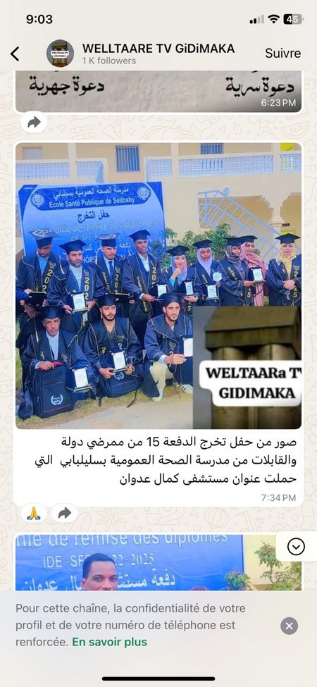 Une photo partagée sur la chaîne whatsapp « Welltaare TV Gidimaka » suivie par plus de 1 000 personnes circule sur ce réseau social et sur Facebook depuis le 30 juin 2025. La légende de cette photo est la suivante : « Photo de la cérémonie de remise des diplômes de la 15ème promotion d’infirmiers et de sages-femmes de l’école de santé publique de Sélibaby. »